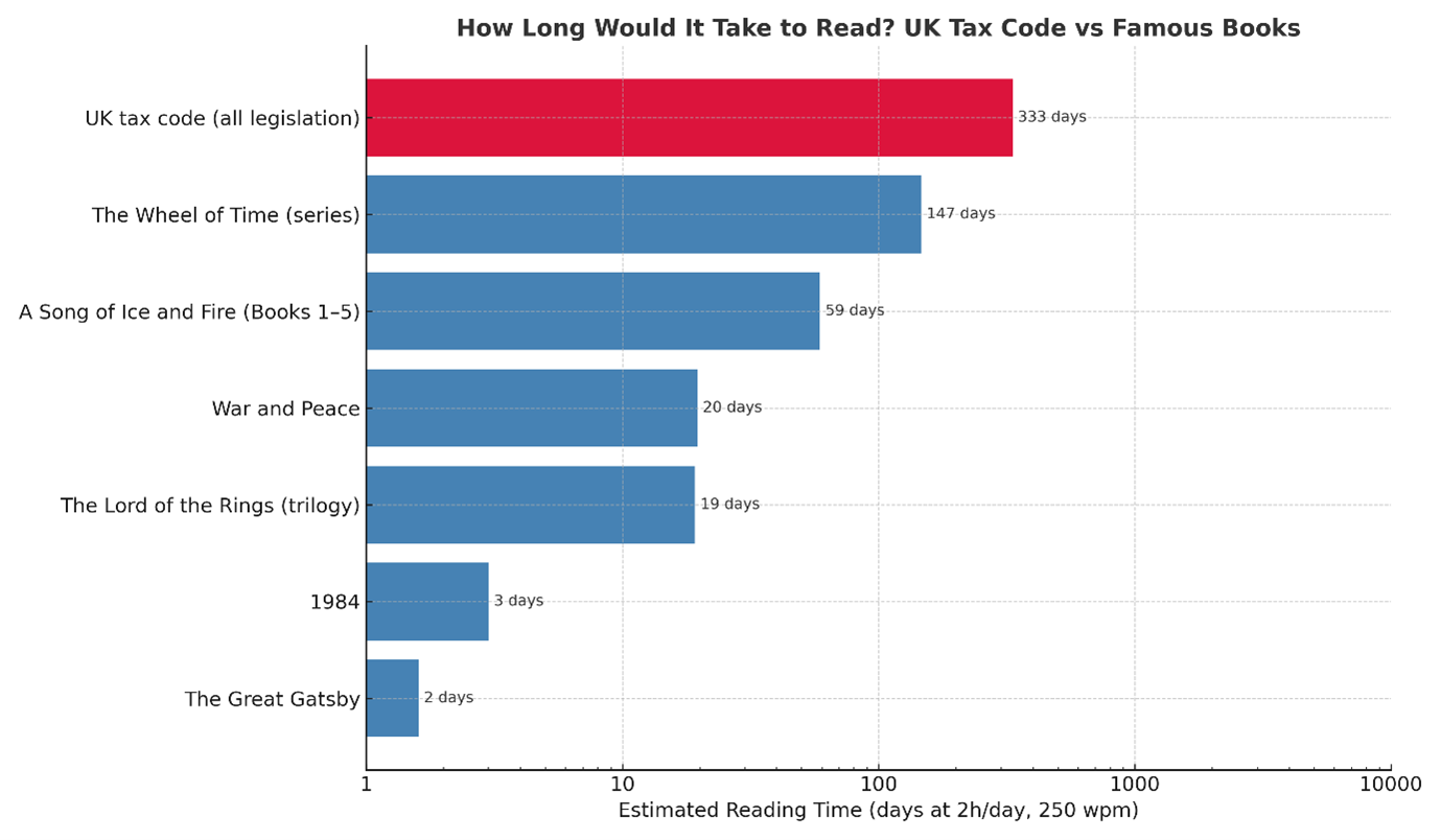 It is longer than every classic of English literature combined. Reading 8 hours a day, no breaks, no holidays and weekends also spent digesting CGT and corporation tax rules, it would only take a brief 11 solid months to get through the full thing.