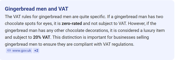 Sticking with the food theme, this time it’s Gingerbread men: No VAT is charged if the figure has two chocolate spots for its eyes, but any chocolate-based additions, such as buttons or a belt, mean VAT is payable. I don’t really know where to go with that one.